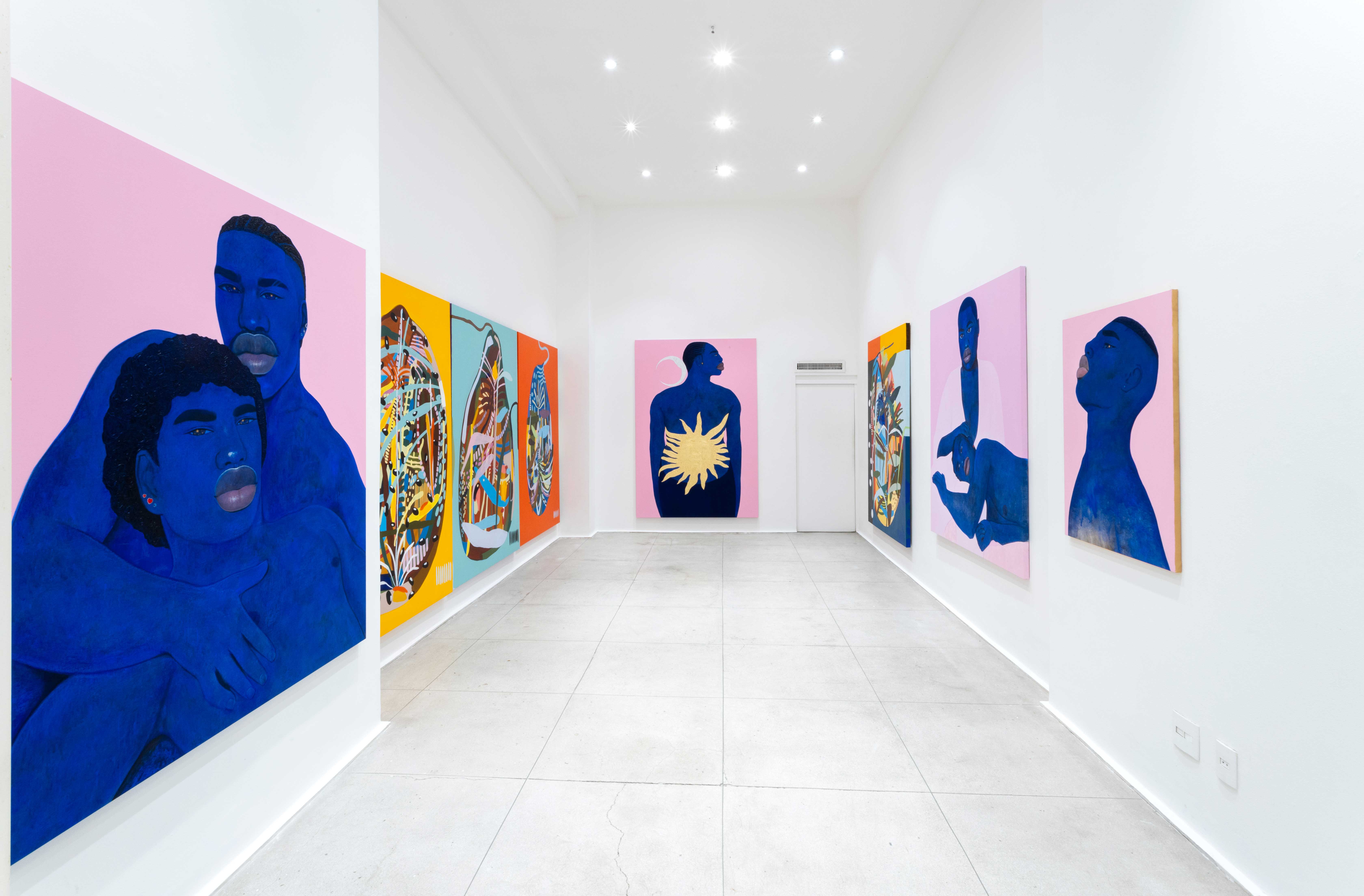 O trabalho de Brendon aborda representações de corpos negros, dando novas perspectivas e acrescentando outras camadas à subjetividade desses indivíduos. São corpos que trazem toda a serenidade, tranquilidade, harmonia e mistério presentes na tonalidade azulada de suas telas. Já Aristizabal traz em sua pesquisa a vitalidade existente nos povos originários da América Latina, por meio de cores, formas e expressões apresentadas em seus trabalhos. O artista também encontra inspiração para o dinamismo de suas pinturas na capoeira; expressão corporal que carrega em si um legado de resistência à exploração colonial.